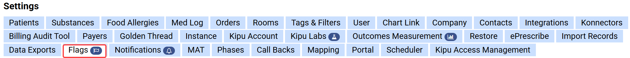 There are patient flags specifically designed for MAT facilities, including stop dose, no-show, and random drug screen flags. Patient flags are used to record and share information about the patient and cause specific actions within the system like the automatic assignment of a flag based on specific system criteria, selecting a patient for random drug testing, and/or preventing the patient from being dosed. Click here to see how these flags work on the patient chart. Many of the flag settings described below can be used in conjunction to produce the desired system result.