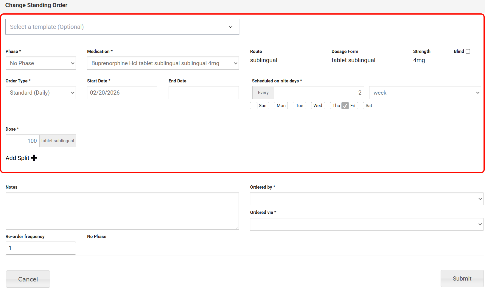 Important: Changing a MAT Order copies the existing order information with a new start date of today or the last date of existing doses, if the patient has already received medication for future dates. Once the change order is saved, the previous order is automatically discontinued and the change order becomes the patient's Current/Active Order.