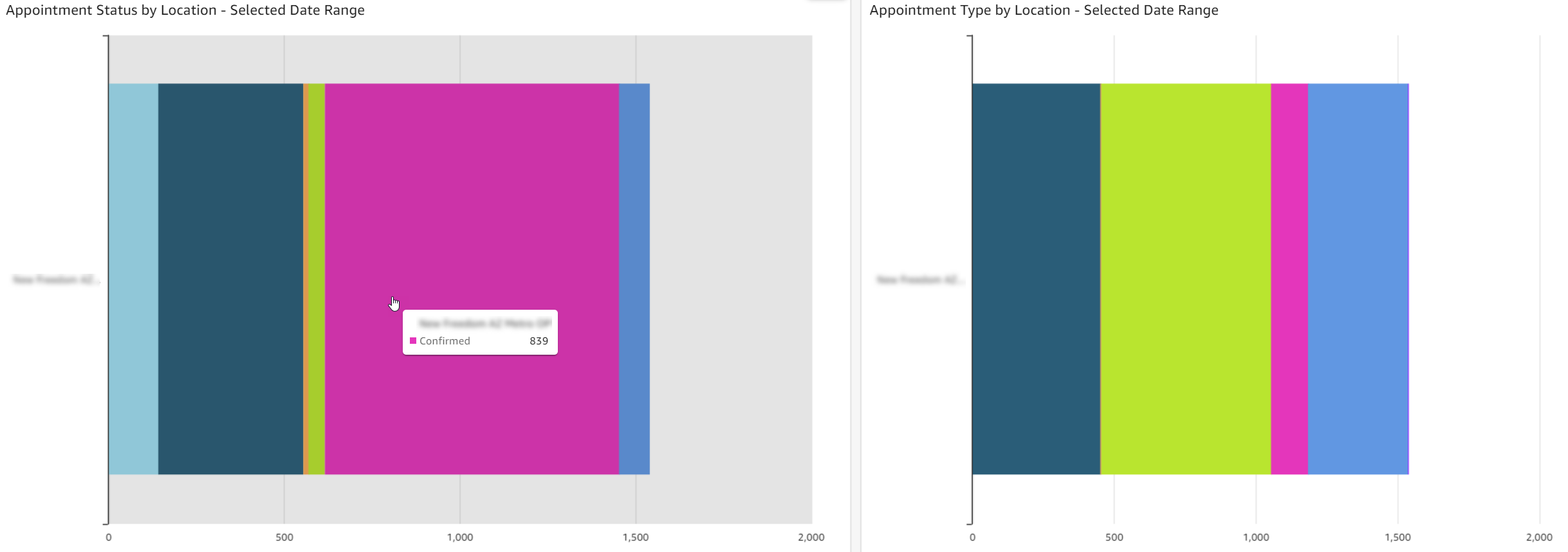 - Admissions - Selected Date Range: This pie chart displays the total admissions for the selected date range broken out by location. Totals and percentages are displayed for each location.