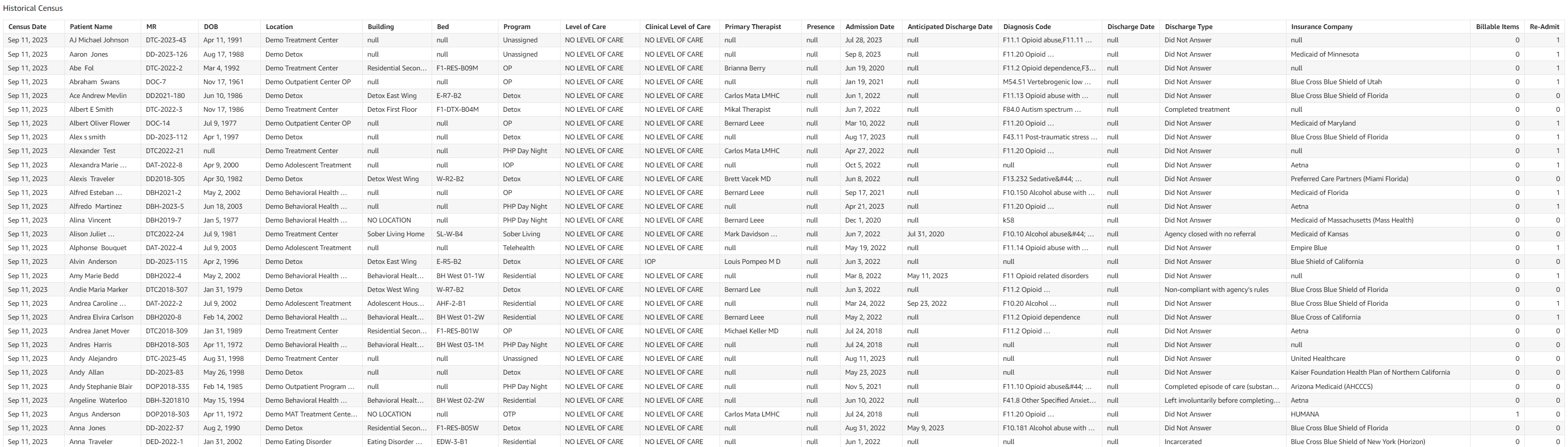 - Census Count on Date Selected: A patient is considered in census when they have an admission date, an MR number, and have yet to discharge as of the date selected.
