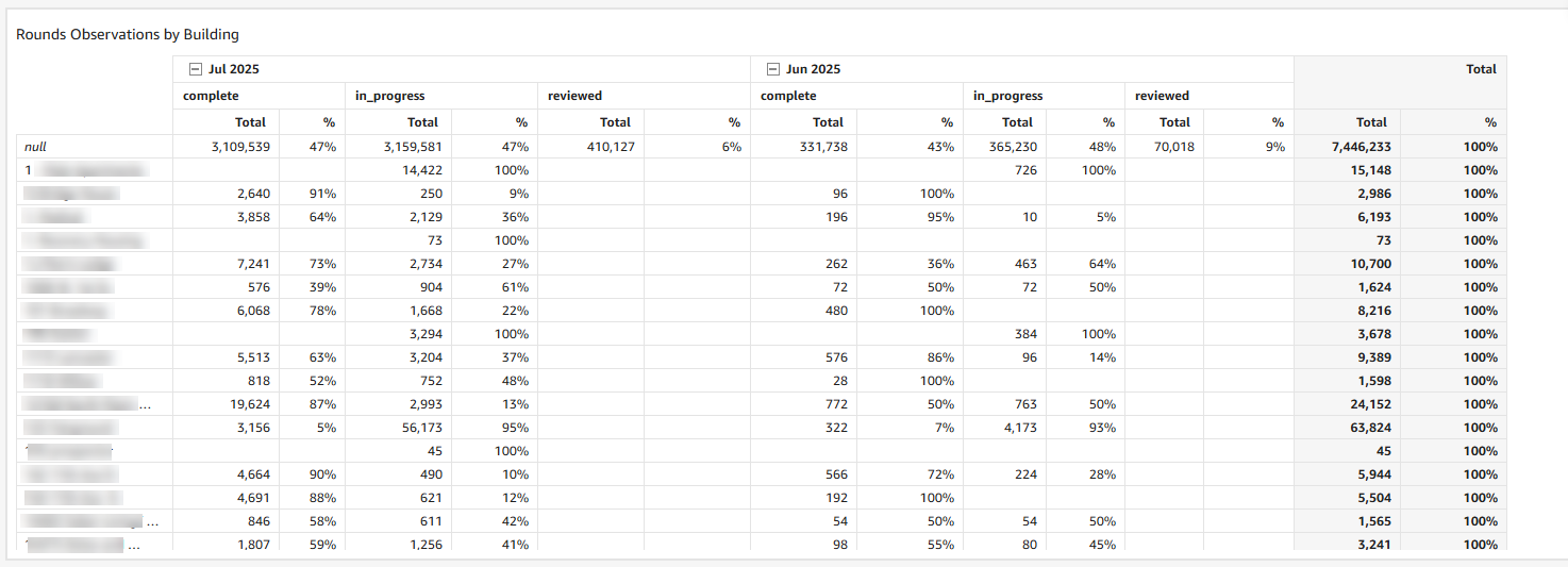 - Reviewed %: The percentage of rounds in the In-Progress status at the given building for the given month.