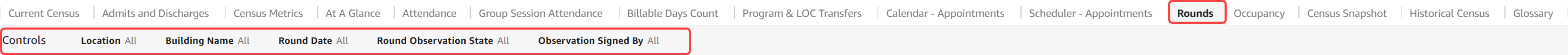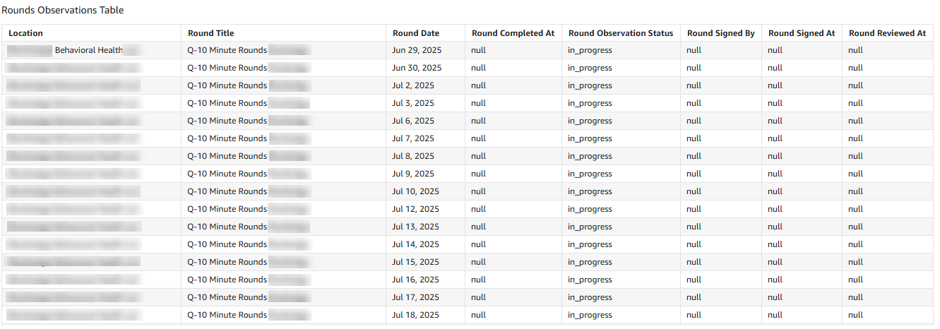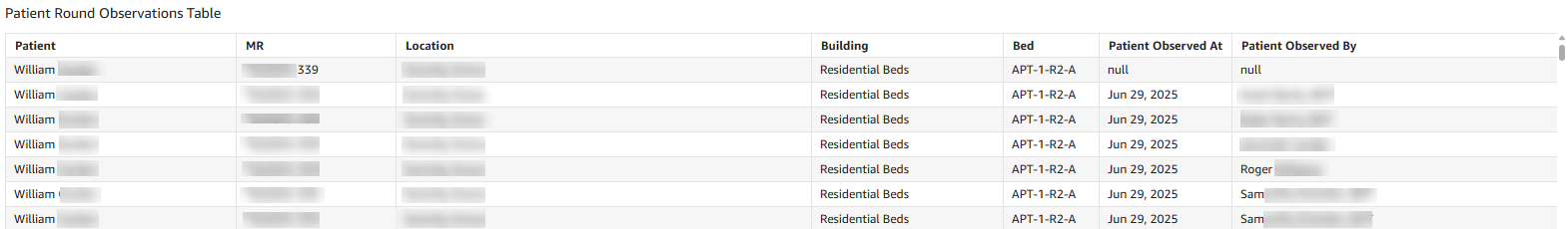 - Patient Round Observation Summary: This table includes the following data points for round observations by patient.