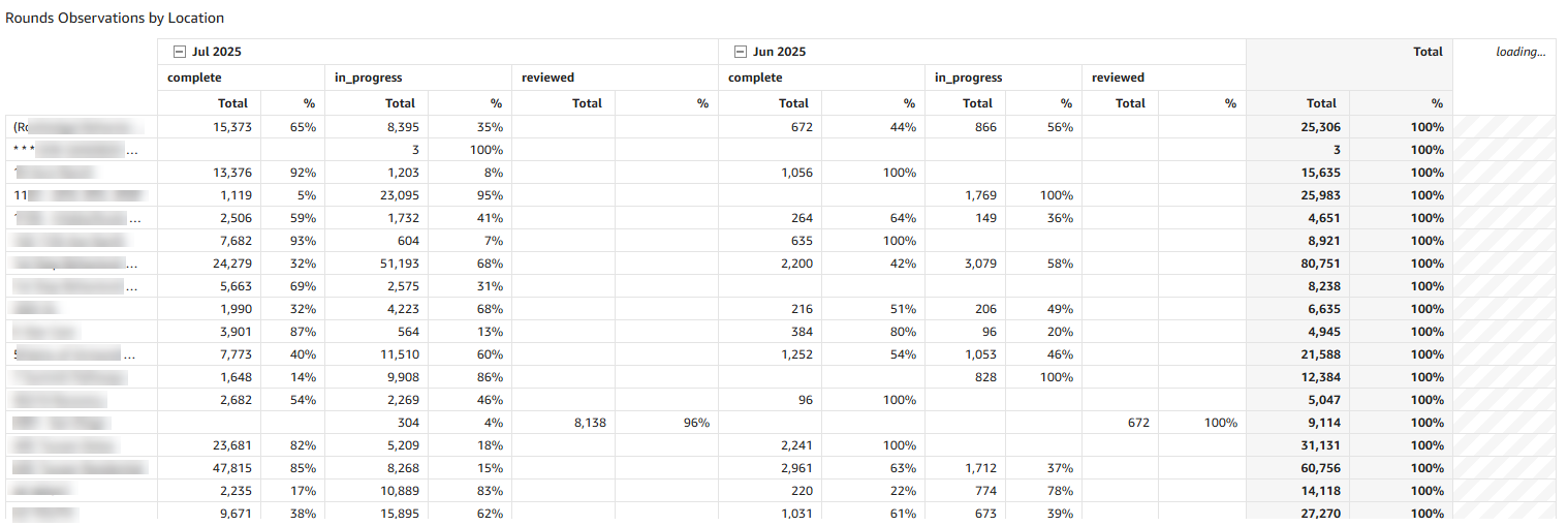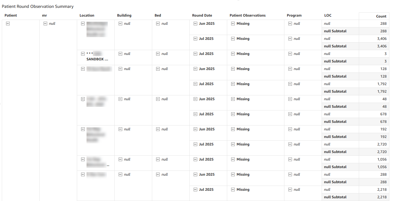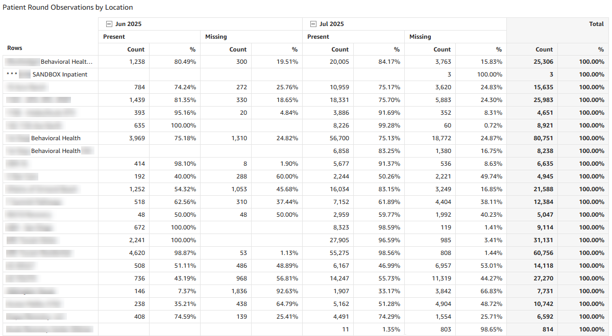 - Patient Round Observations by Building: This table includes the following data points for round observations for each building in a location by month.
