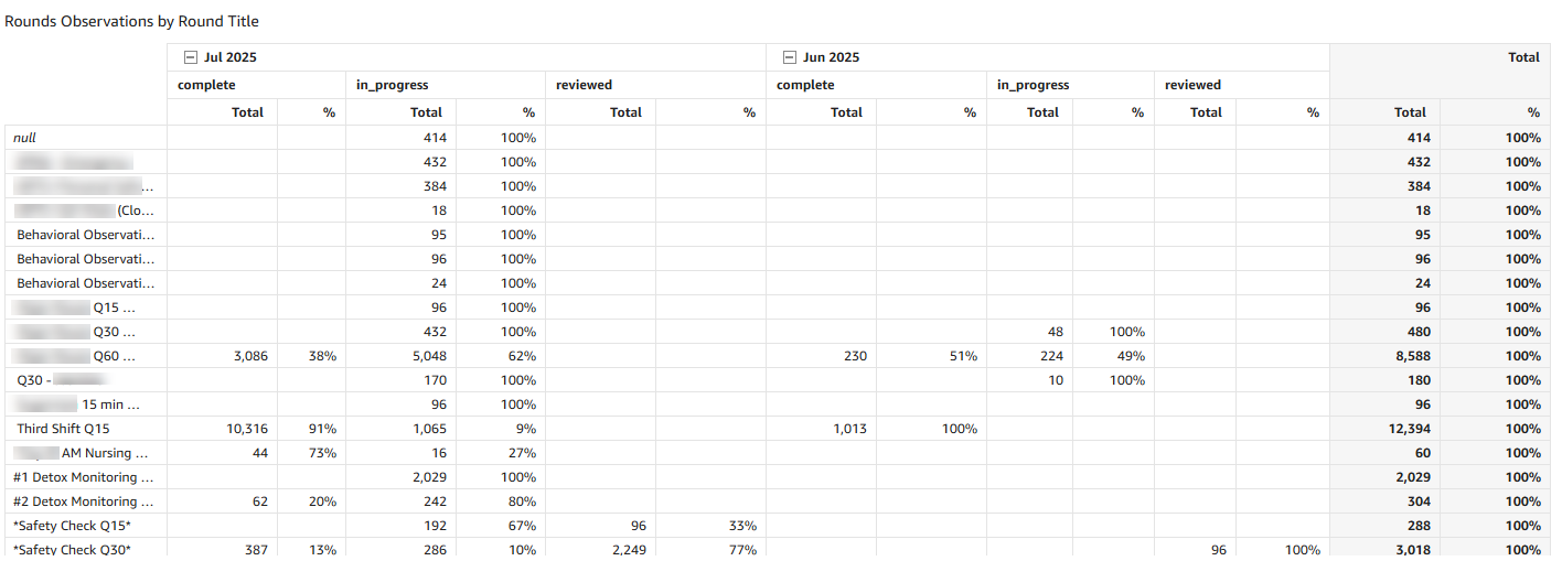 - Rounds Observations by Round Title: This table shows the following information for rounds by round name, month, and status.