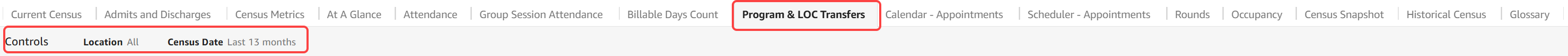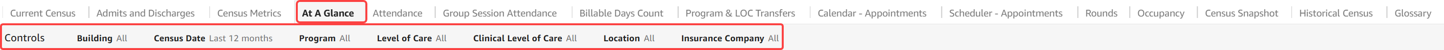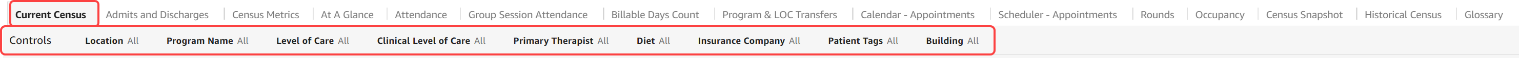 - Census on Date Selected by Clinical Level of Care: The count is based on the most recent MR number in the patient record and program names. count totals are displayed in each tile.