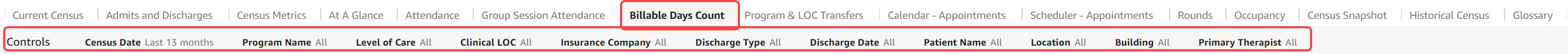 - Days in Census: This is a calculated field that shows the total number of calendar days from the patient's admission date through the current date.