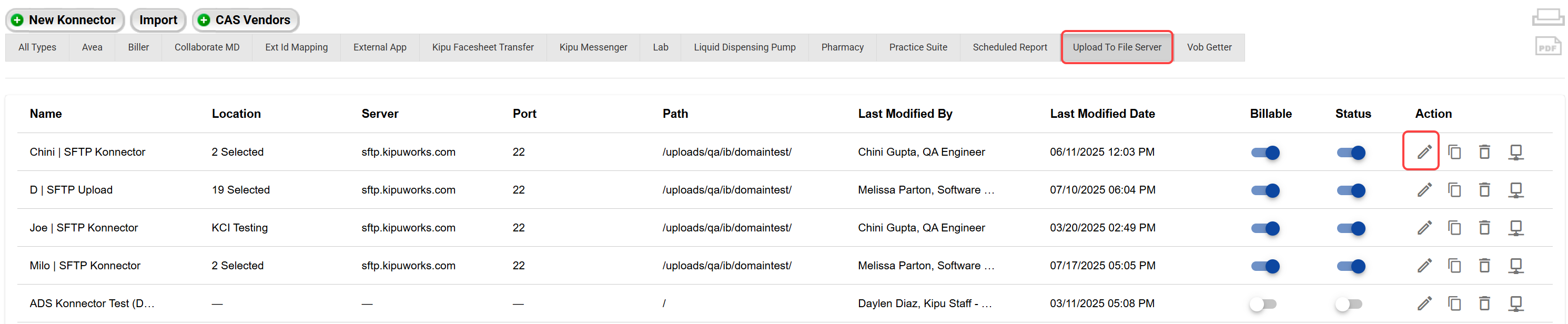 - If you wish to edit an existing konnector, you can click on the Update to File Server filter and then click the pencil icon.