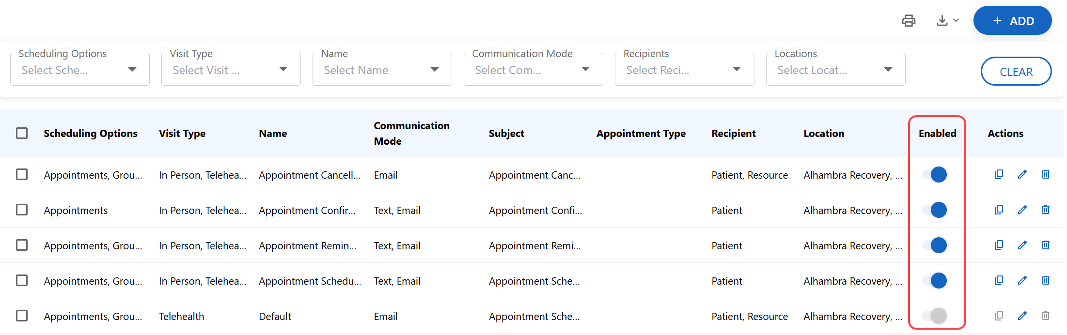 The notable exception here is for telehealth visits (appointments or group sessions). Telehealth communication cannot be disabled as this is the only way to ensure the patient receives the correct link to join their session.