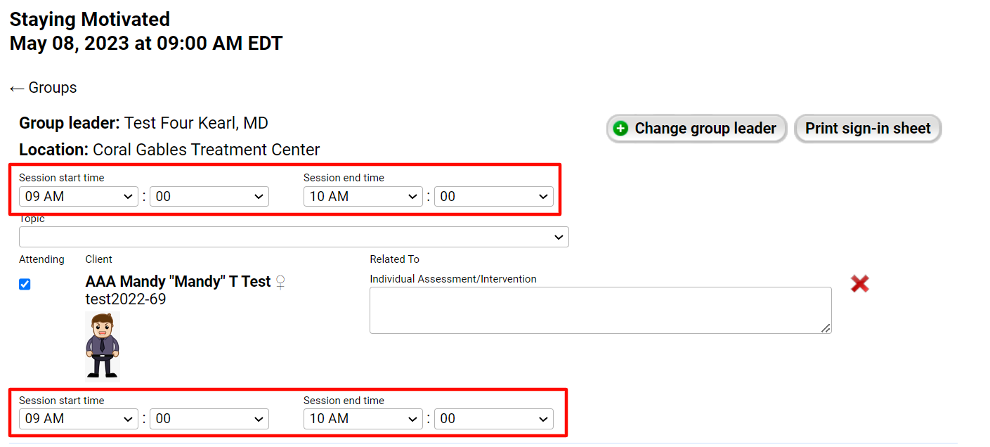- The Group Leader goes back in to add their notes at a later time, updates the end time from 10:00am to 2:00pm, and begins adding the Individual Assessment/Intervention notes for the patient. However, the system doesn't automatically update the End Time for the individual attending patients.