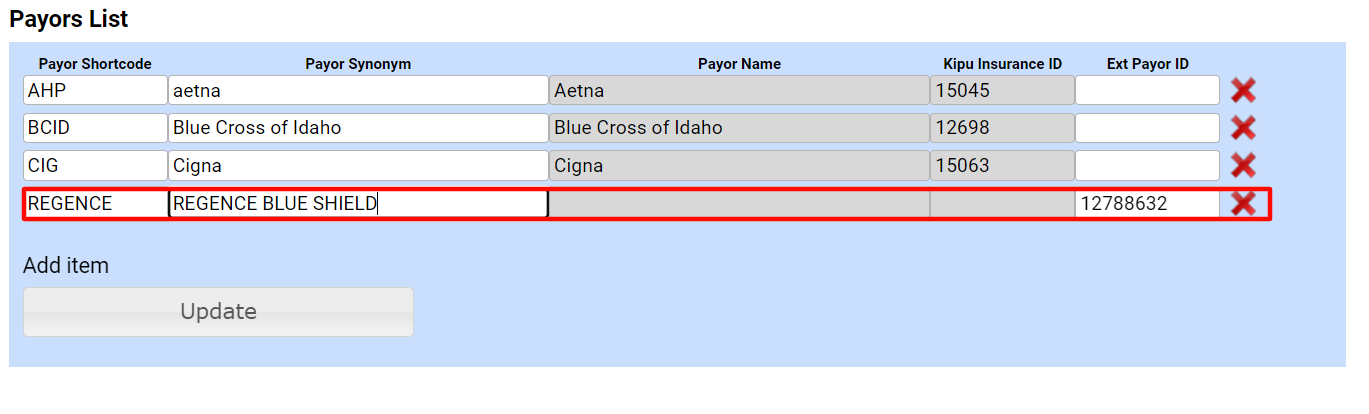 - You can once again manually change the Payor Synonym field to the desired information and then select the Update button to save.