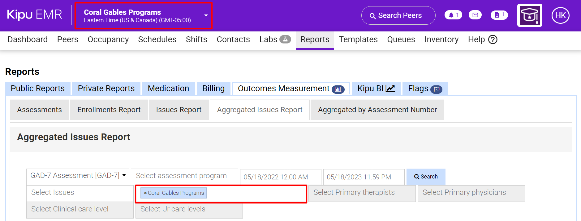 - Navigate to Reports > Kipu BI > Clinical Outcomes > Outcomes Measurements.