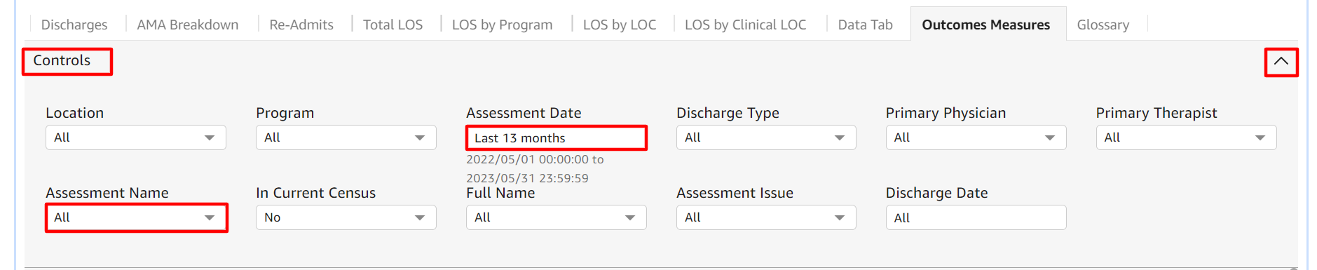 - Select either the word Controls or the little arrow in the top right corner of the gray Controls bar to get your filter options. Now you can select which of the assessments you want to include, select a date range greater than one day, and choose from the other options seen below.