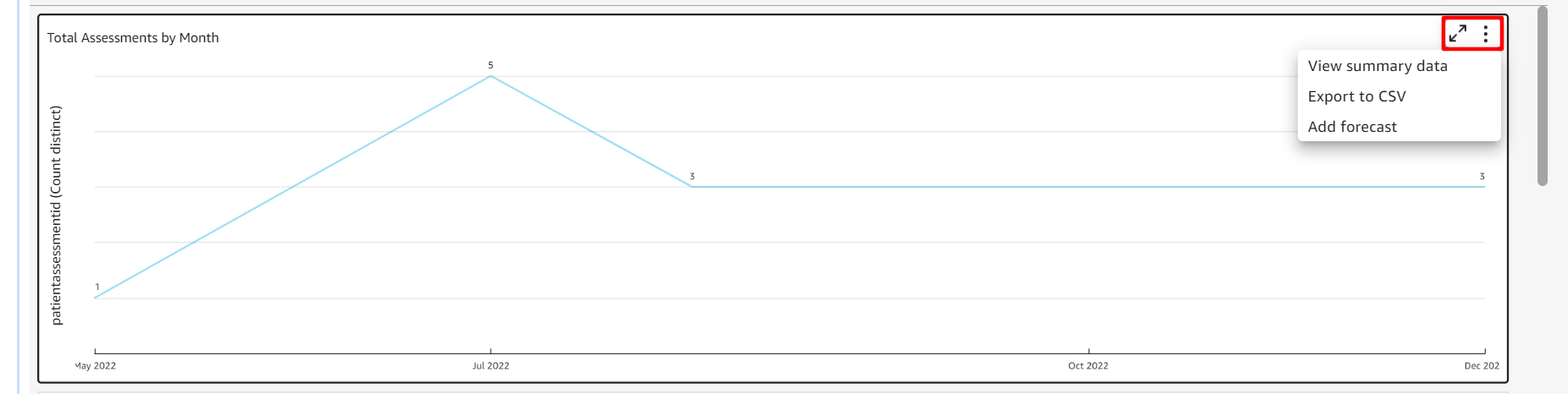 - If you need to create a copy of these reports select the little box that appears in the top right corner of the graph or data point when you hover over it with your cursor and select the three vertical dots. The two arrows pointing away from each other will expand the view of the graph/data to take over the whole screen view.