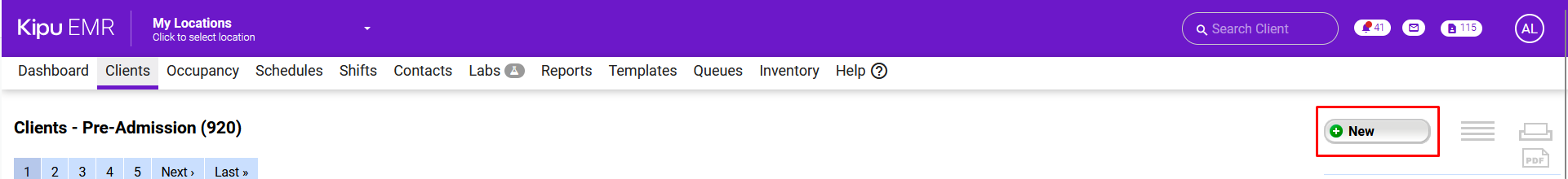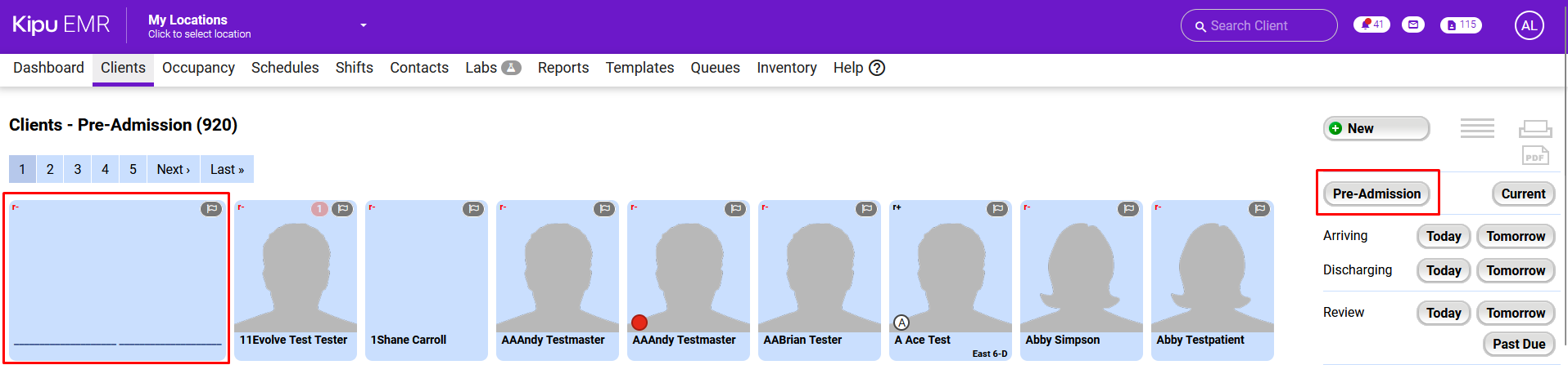 - Return to the Clients page and click the Pre-Admission button. Here, you'll see the test patient you created earlier.