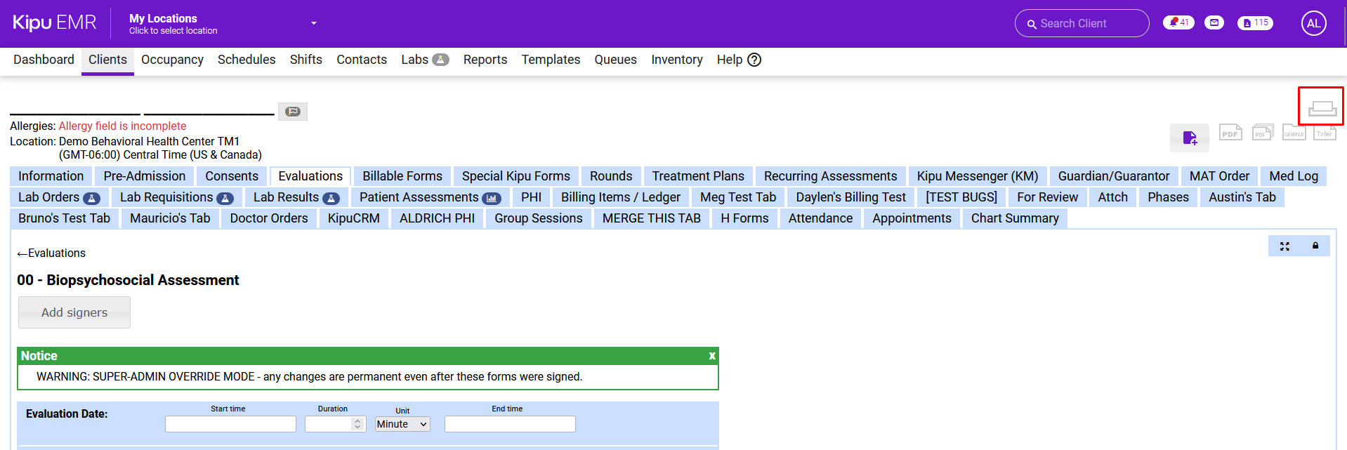 Follow the steps below for instructions on how to print an evaluation without patient data.