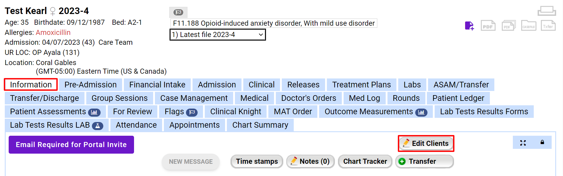- Go the patient's chart, click on their Facesheet/Information tab, and select the Edit Clients button.