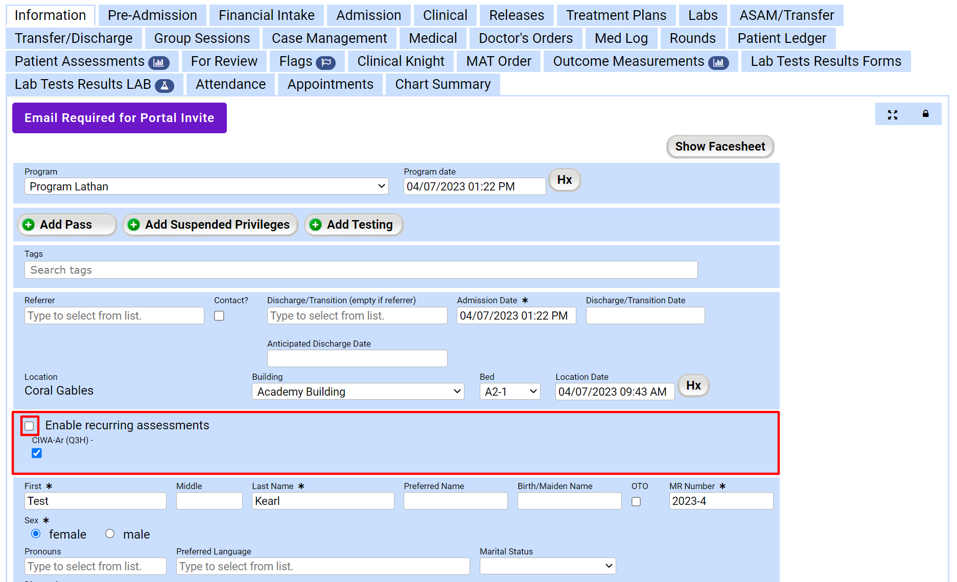 Kipu EMR, Recurring Assessment, Templates > Evaluations, Facesheet/Information page