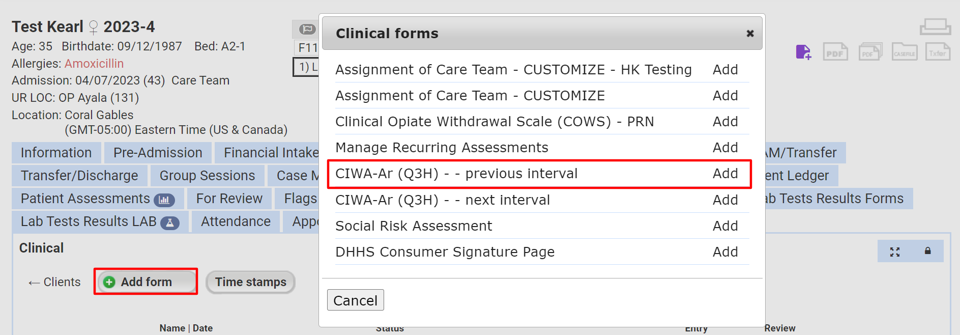 - Because the assessment was not active when the interval passed you will need to manually add that first interval. Go to whichever tab your facility uses for assessments, select the Add Form button, and choose the version marked previous interval to add the missing interval and proceed as intended.