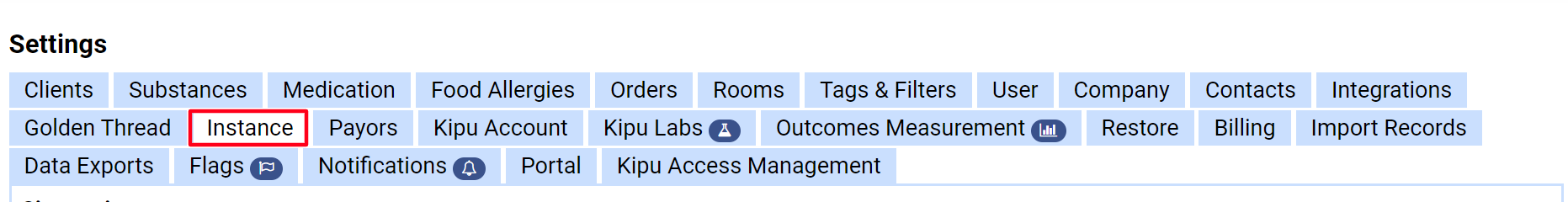 Kipu EMR, Single Instance: Settings > Instance tab, Master Instance: Settings > Company tab, Role: Super Admin