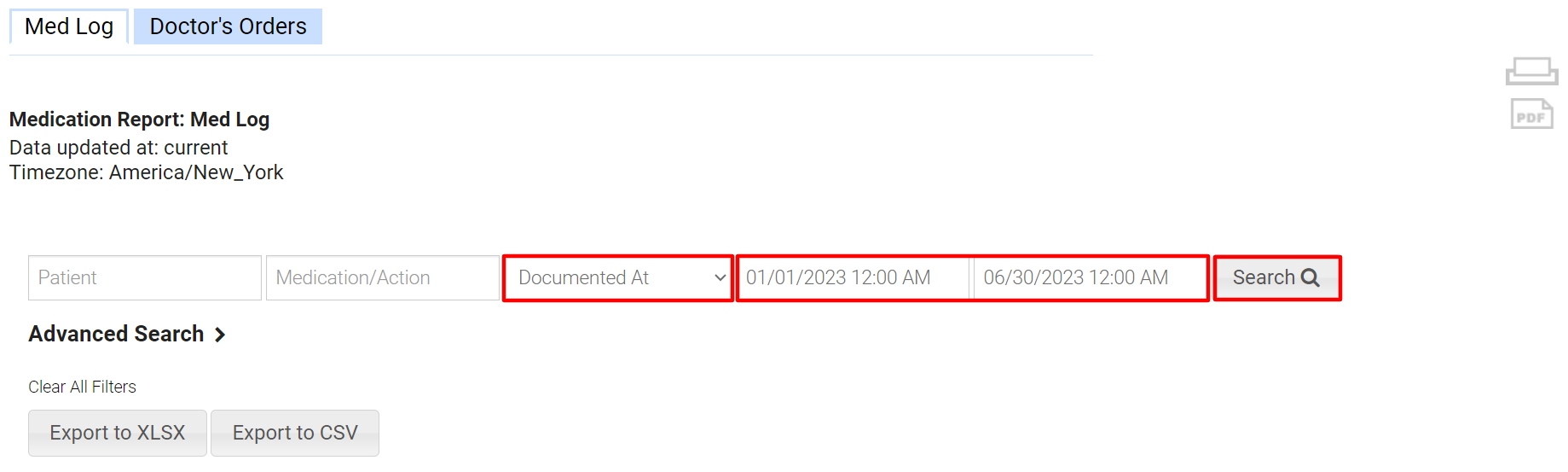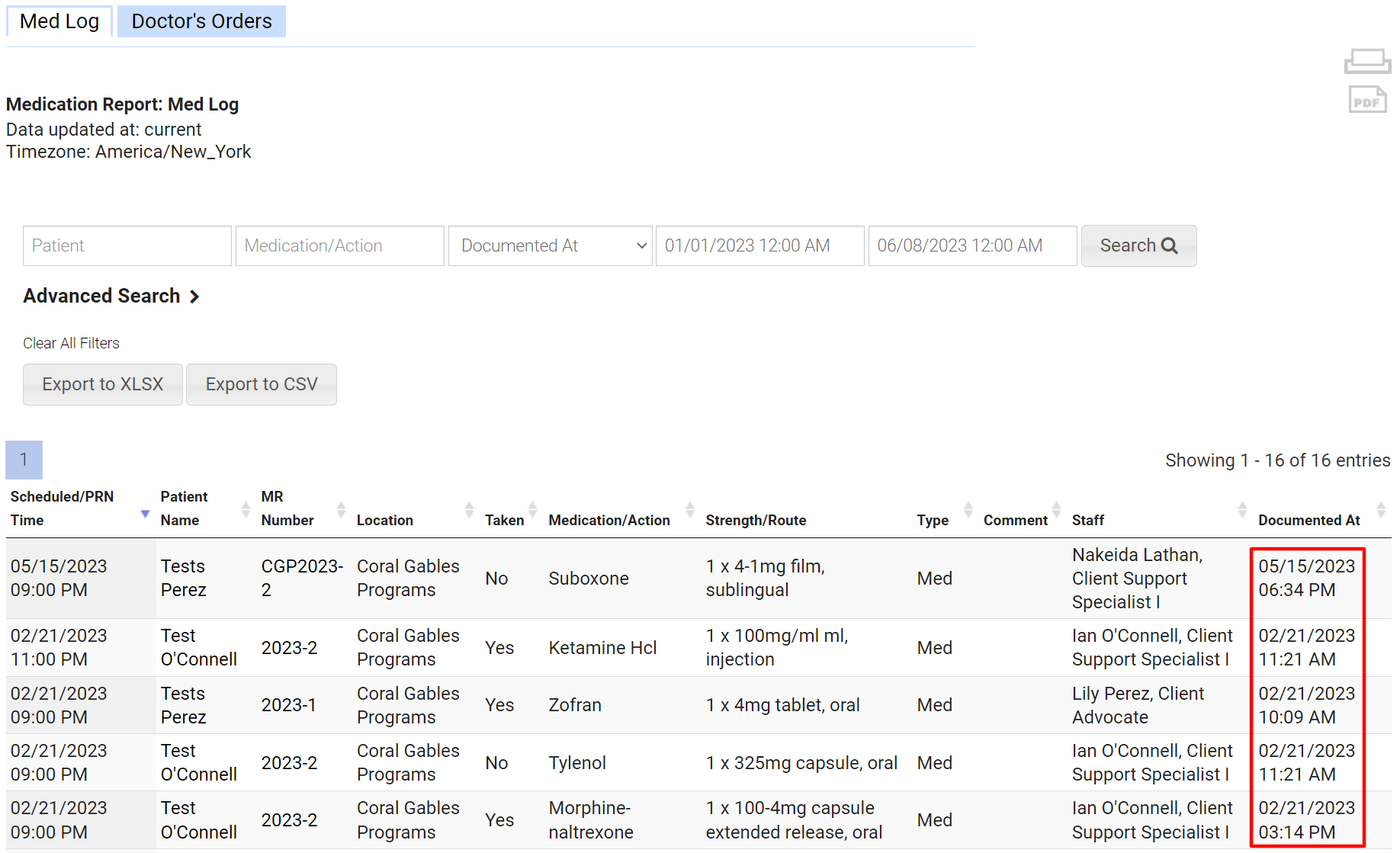 The name of this tab may be different in your instance if the name has been changed under Settings > Clients. - Change the drop-down showing Current Census to Documented At, choose your timeframe in the From date and To date fields, and select the Search button.