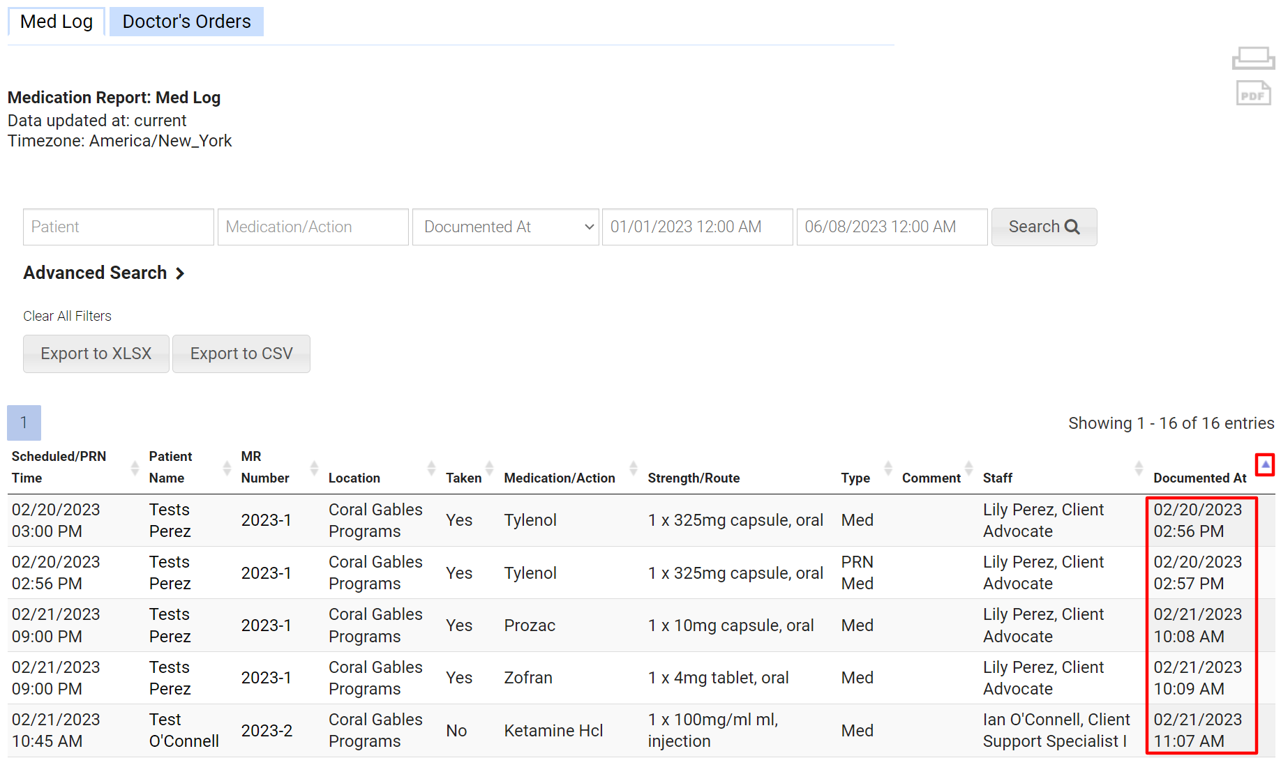 - If you want to view the data in chronological order instead of newest first, click on Documented At again. Additionally, you can use the arrows by the other columns to sort by that data.
