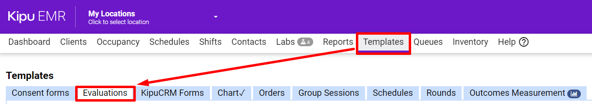 - Begin by clicking Templates > Evaluations.