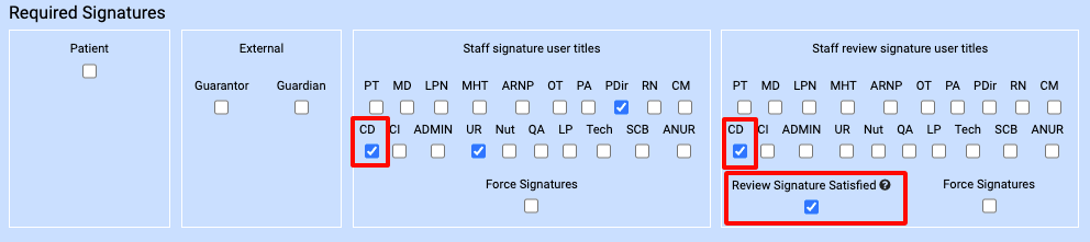 - The Force Signatures option will require the signature of at least one staff member per selected function before being moved to the Ready for Review status.