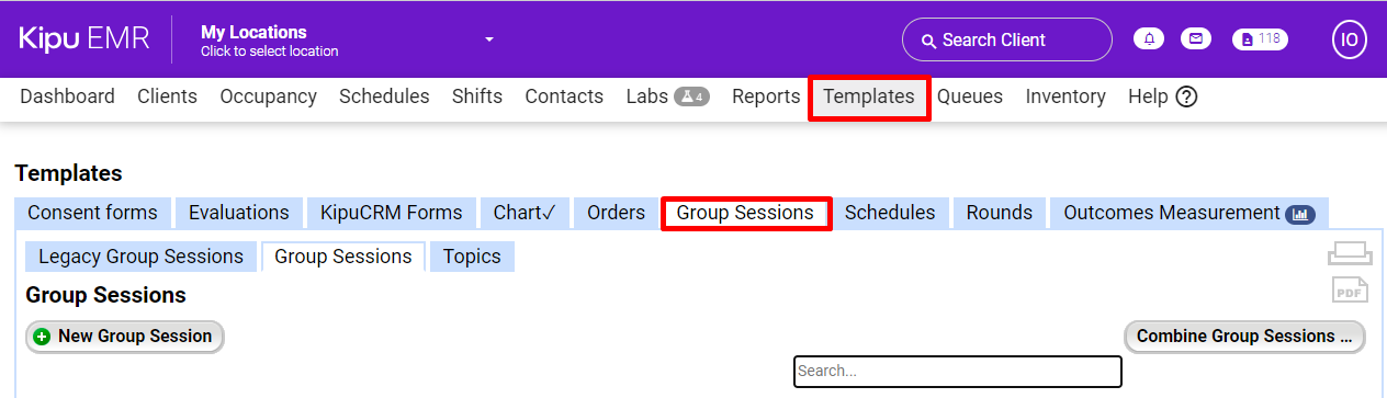 Kipu EMR, Users: Super Admins, Feature: Manage Templates - Group Sessions