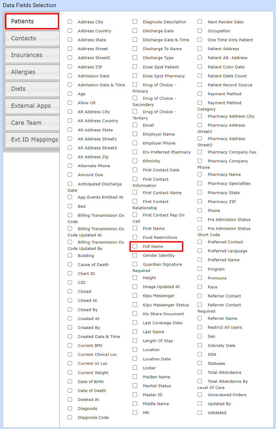 - The Data Field Selection defaults to the Patients tab where you will select the Full Name checkbox.