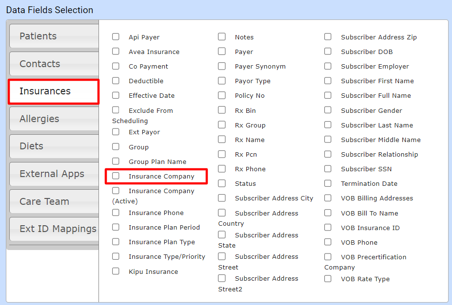 - Within Data Field Selection choose the Insurances tab and select the Insurance Company checkbox.