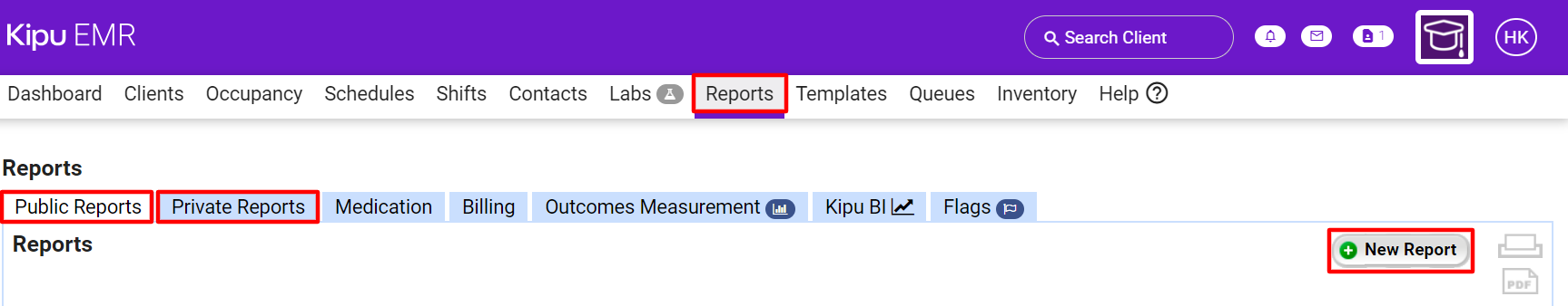 - To begin, select Reports then Choose between a Public or Private report and click the New Report button.