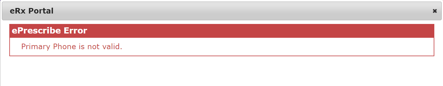 To resolve the error message "ePrescribe Error: Primary Phone is not valid" when trying to enroll a patient in eRx, confirm the phone number has been entered validly following these steps: