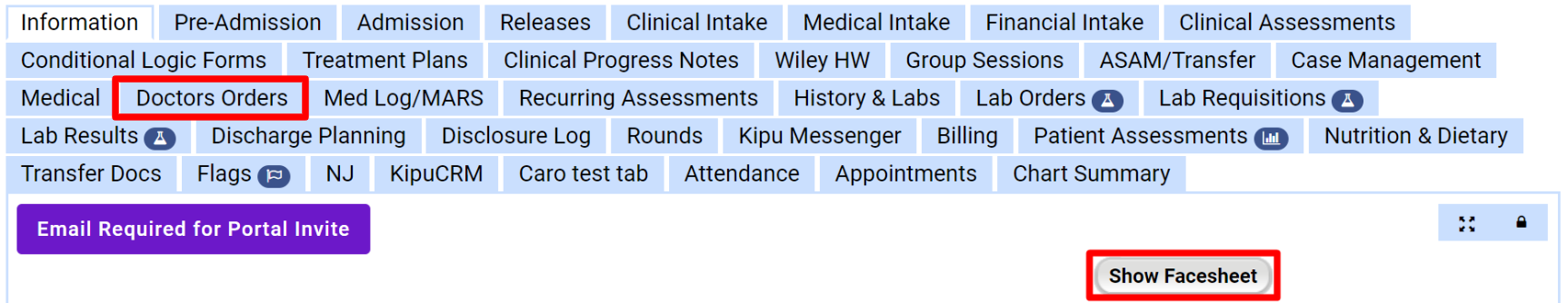 - Select the Show Facesheet button to confirm the changes, then proceed to the Doctor's Orders tab.