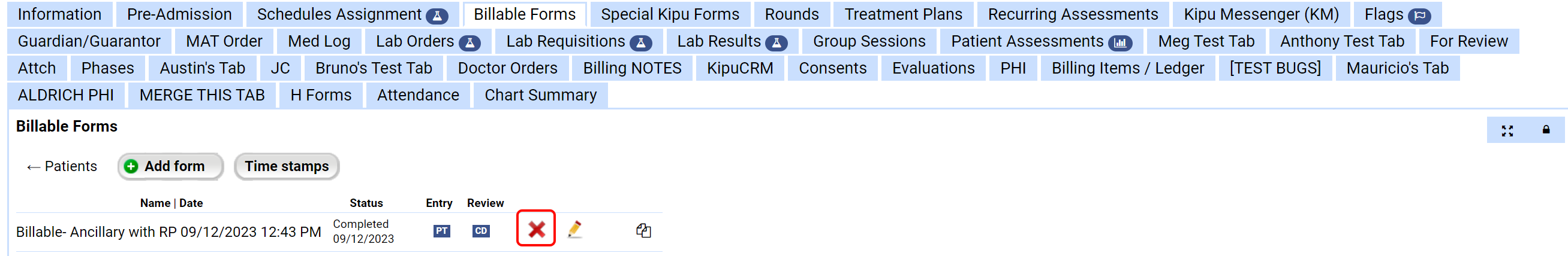 To get started, navigate to the tab on the patient's chart that contains the form you want to delete and click on the red x.