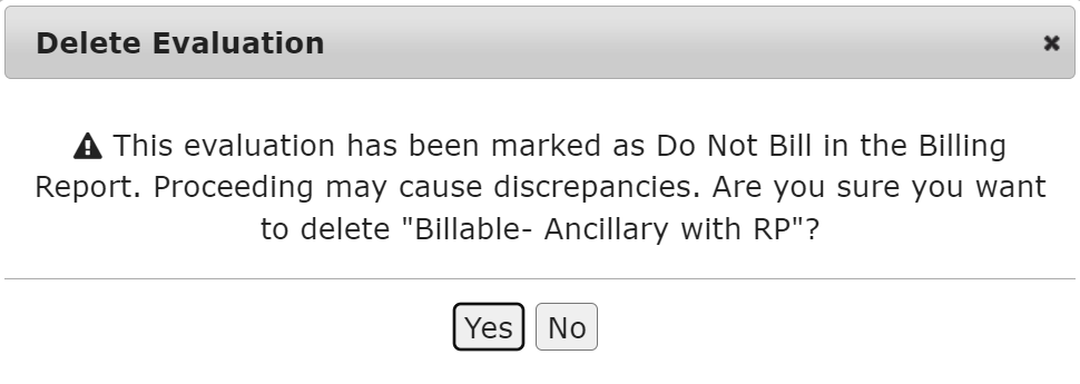 - If the evaluation was sent to the Do Not Bill tab of the Billing Report, you will see the following message instead. As before, click Yes to delete, and No to cancel.