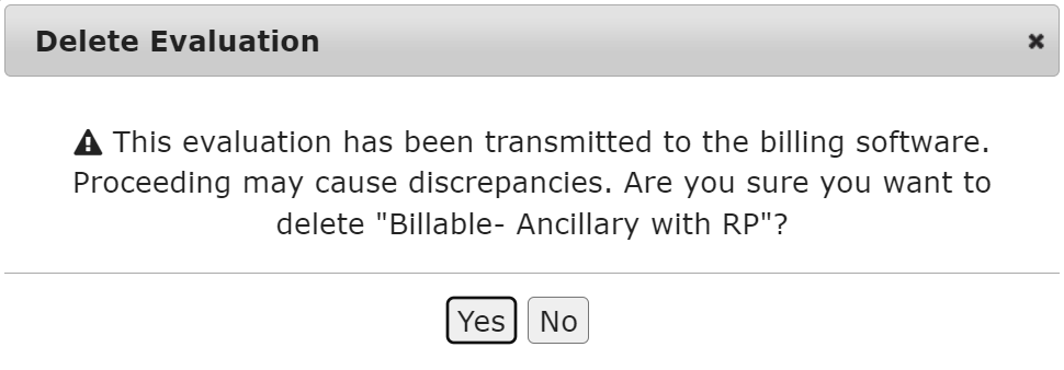 - If the evaluation has already been sent to the billing software (e.g., CMD, HL7, or Kipu RCM) from your billing report tab, you will get the following message instead. Again, click Yes to delete, and No to cancel.