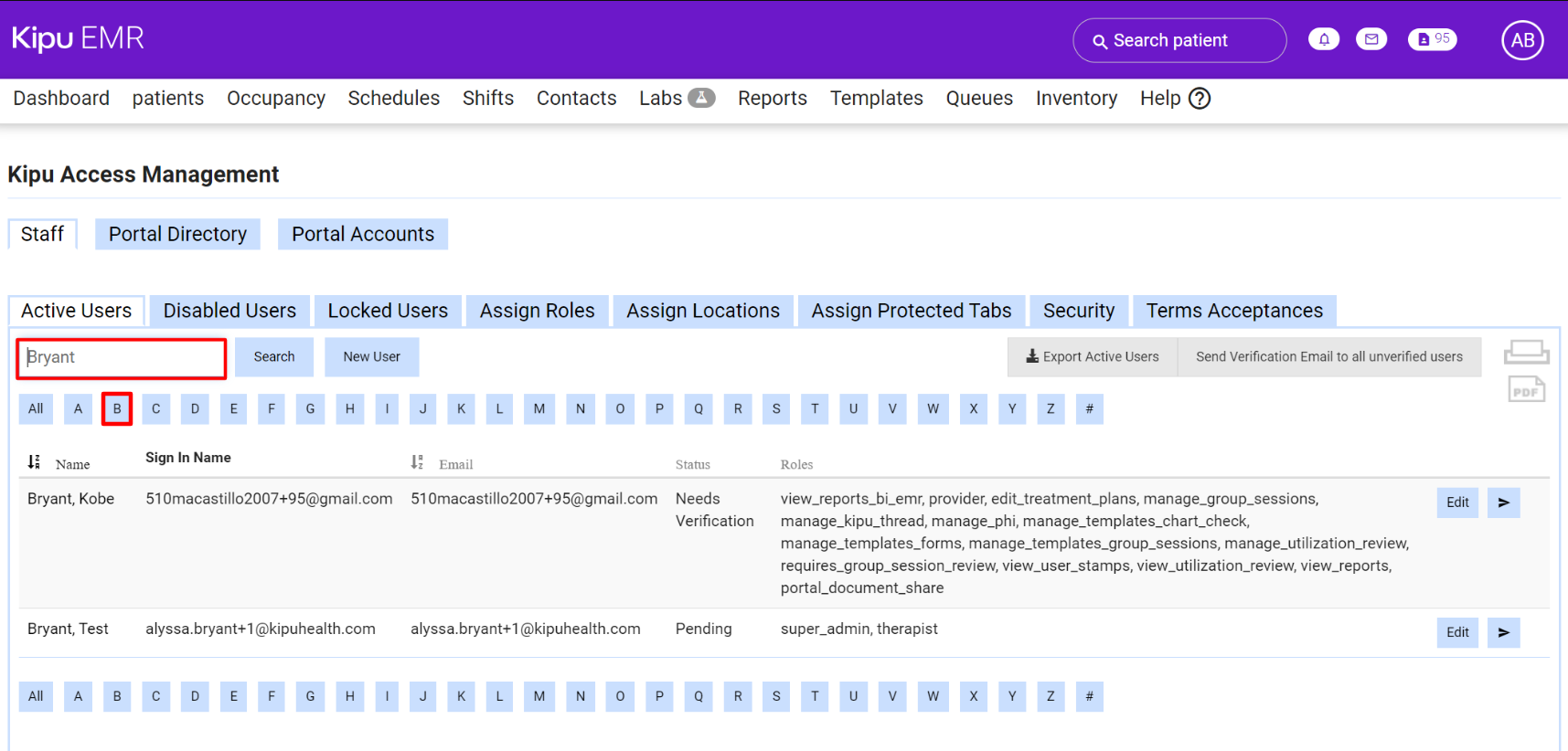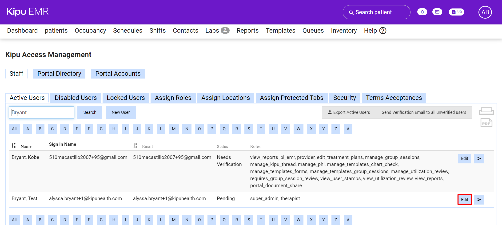 Kipu EMR, Roles: Super-Admin, Features: Manage Users, Group Sessions