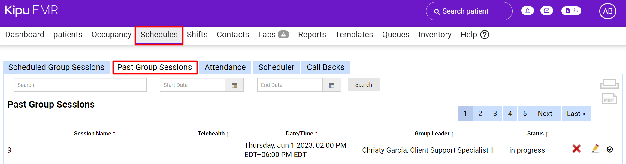 - The user with the Chart Auditor role assigned will then go to the Schedules tab, then the Past Group Sessions tab.