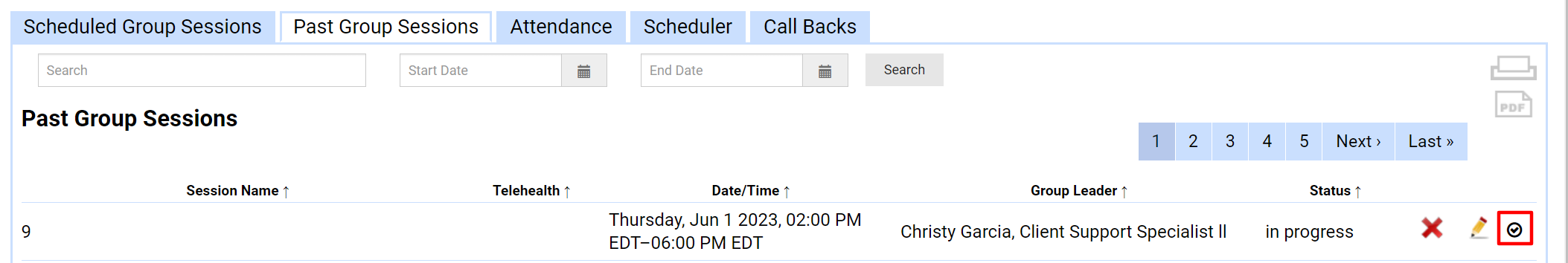 - Locate the Group Session in question either by scrolling through the options or using the filter to search, then click the Mark as Completed icon next to the edit pencil.