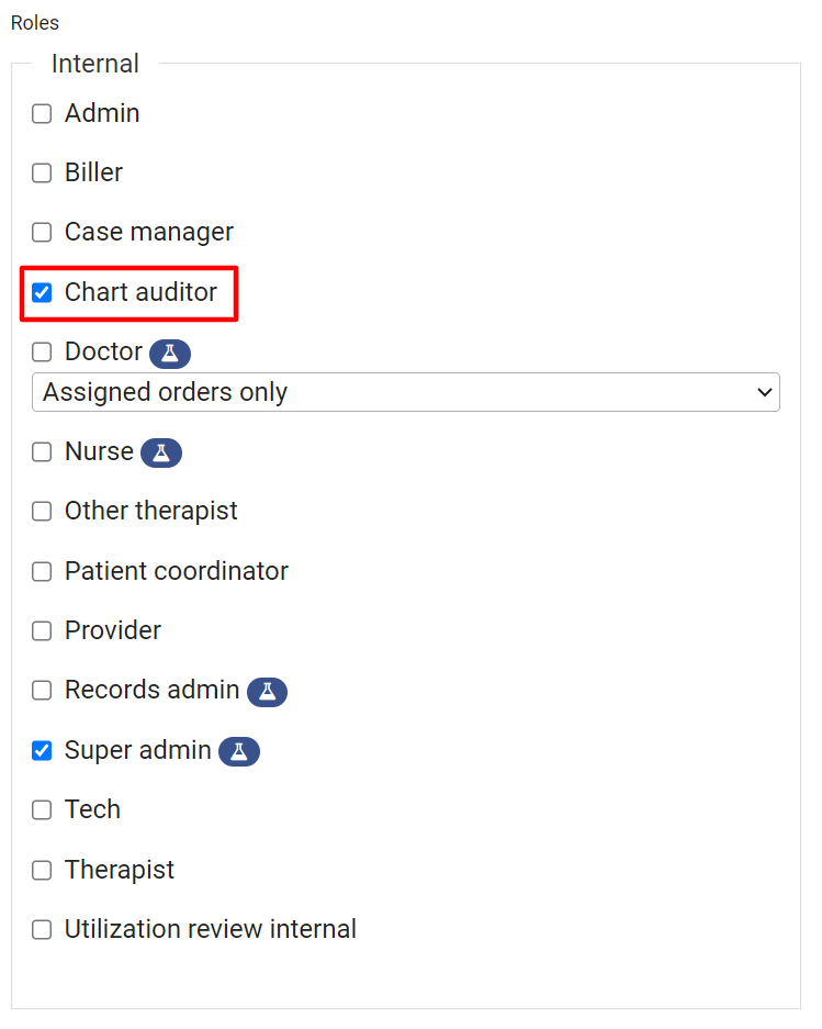 - Scroll to the Internal Roles on the left side of the checkbox options, and select Chart Auditor.