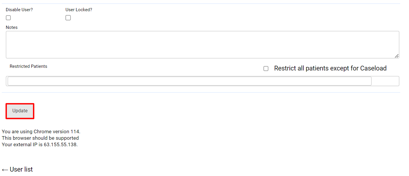 - Click the Update button at the bottom to save your changes to the user's profile.