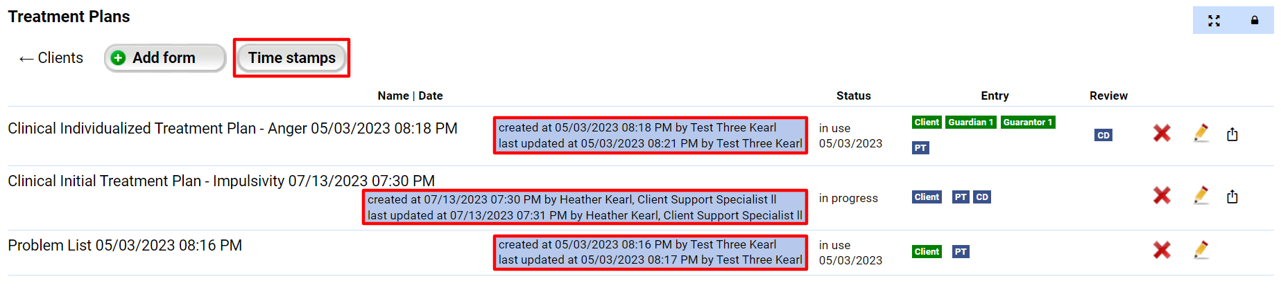 Alternatively, if a user profile has the View User Timestamps feature active, you can also see who created a form and when it was created and updated by navigating to the tab where the form is located and clicking the Time Stamp button.