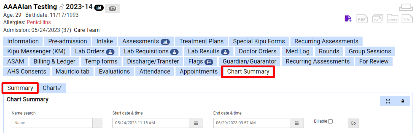 - Navigate to the patient whose chart history you wish to review and select the Chart Summary tab.