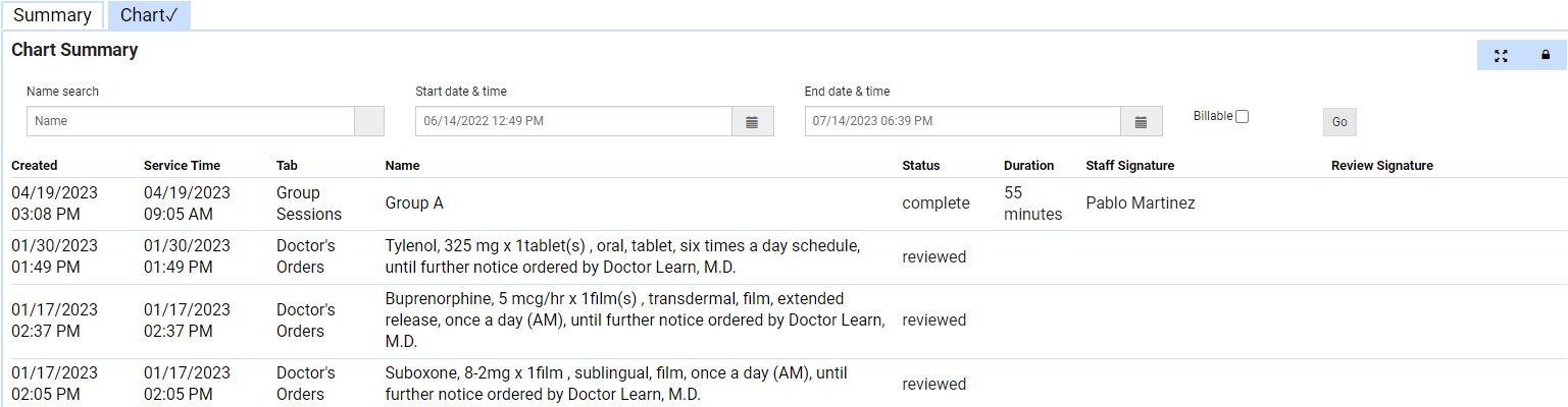- The Chart Summary tab shows the history of consents and evaluations added to the patient's chart. Information includes: the date added, last service time, tab it was added to, name of the form, form status, duration, staff signature, and review signature.