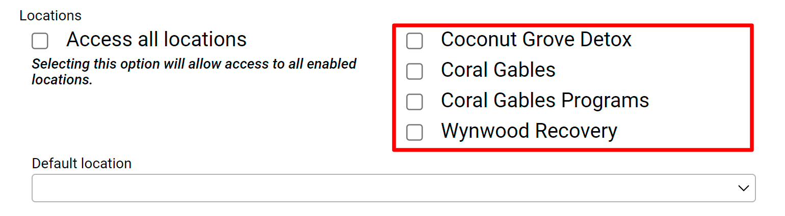 A Super Admin or user with the Manage Users Feature enabled and the Access All Locations permission checked can follow the steps below to fix this issue. If no Super Admins in the instance have the Access All Locations permission selected, an Executive Level user or the facility's owner must send an email to Kipu including written permission for Kipu Staff to add the Access All Locations permission to a specified user's profile.