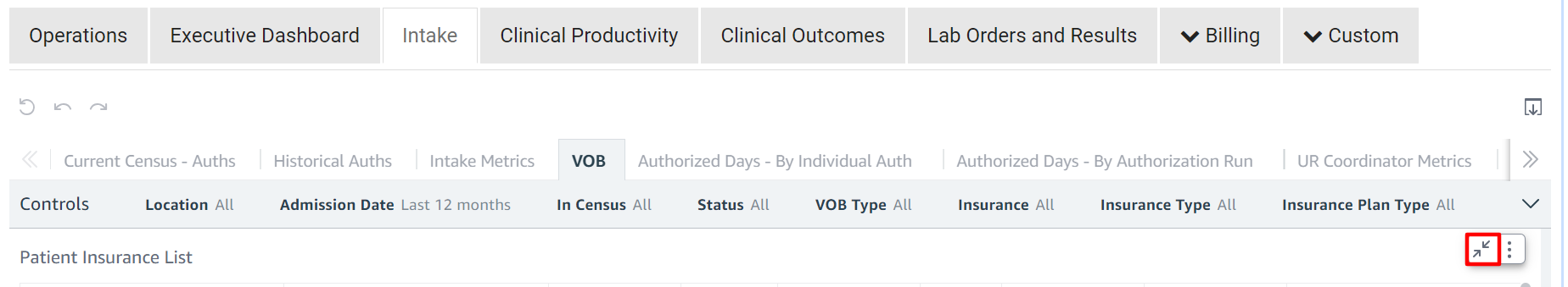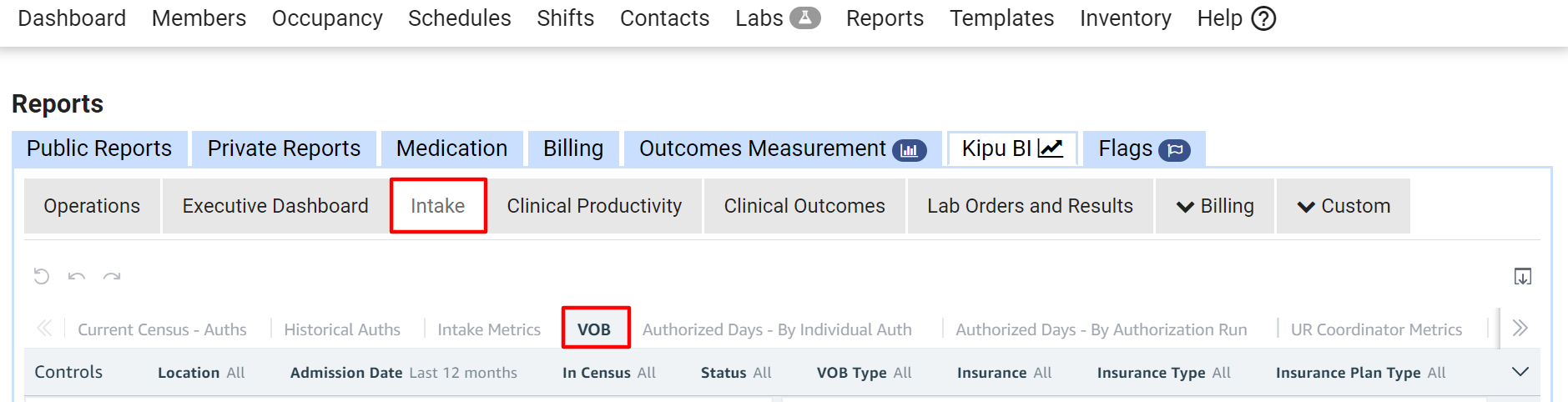 - Click the Intake tab and then select the VOB option.