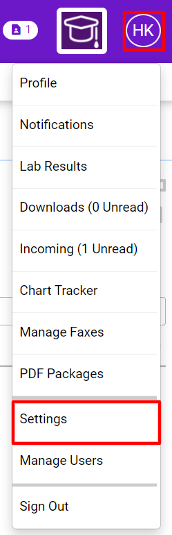 - Select your Initials in the top right corner and choose Settings.