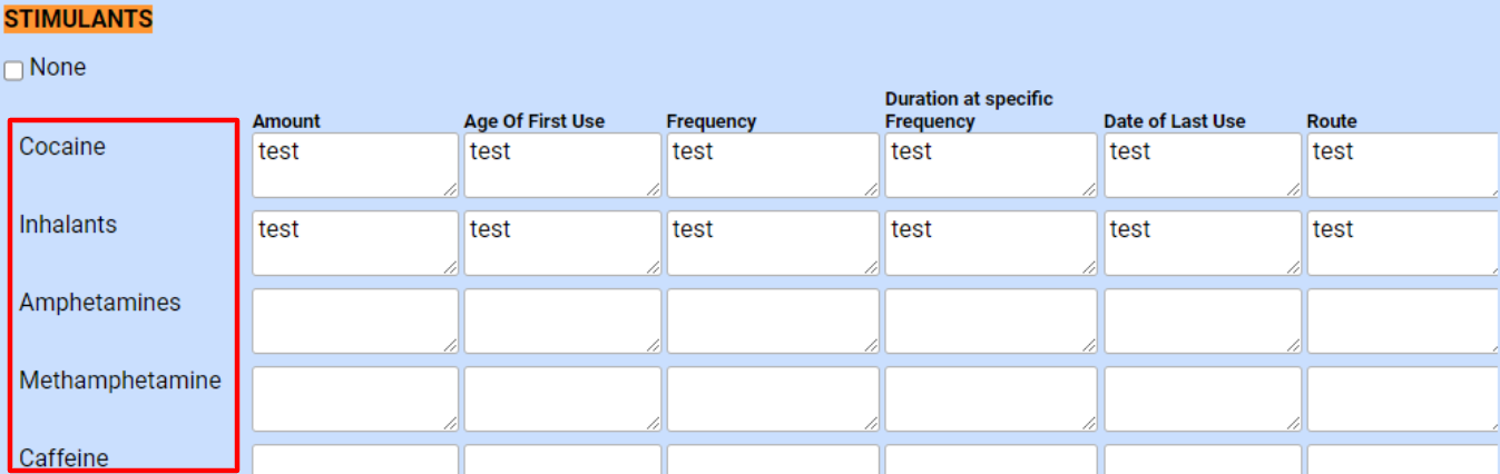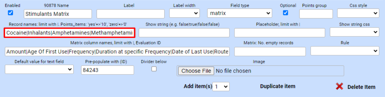 - Review both evaluations to ensure all relevant details can flow from one form to the other with matching field types. In the example below, while both are correctly set up with a Matrix field type the Stimulant column is not in the same order.