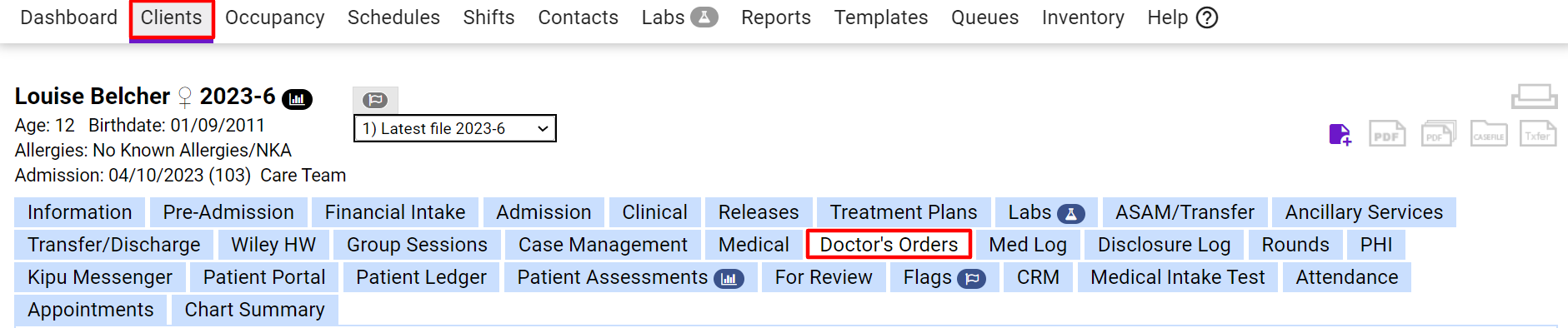 - From the landing page, select the patient whose form you need to print and navigate to the Doctor's Orders tab.