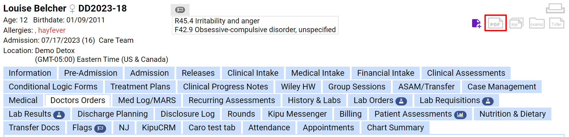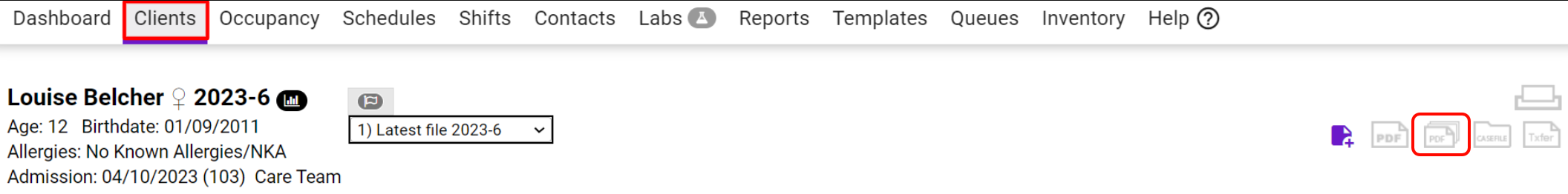 - From the client's landing page open the patient's chart and select the PDF icon with pages behind it.